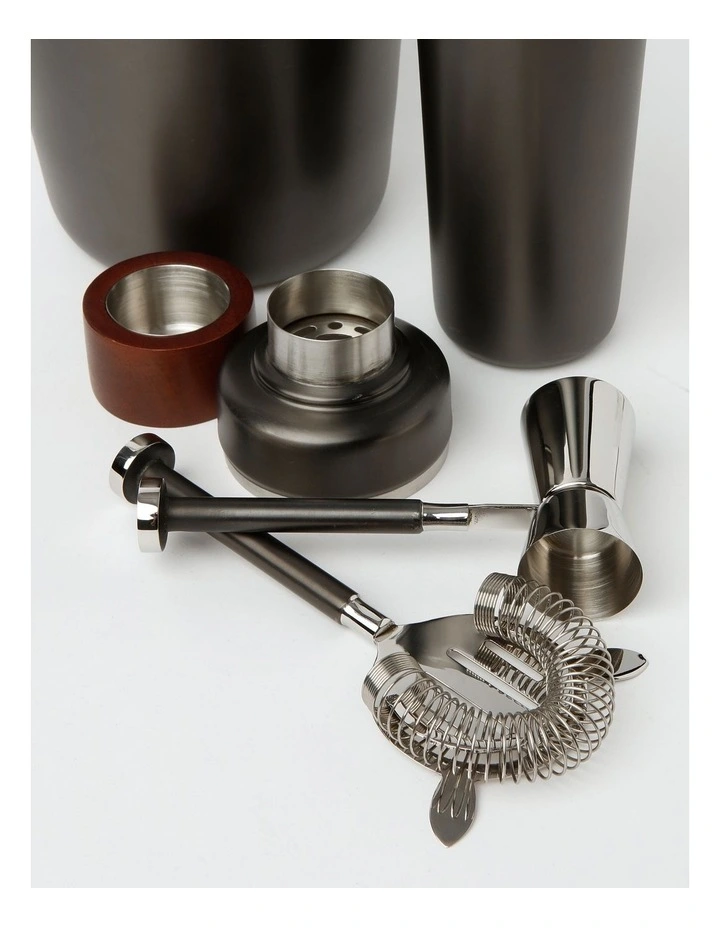 - Set includes: ice bucket, cocktail shaker, jigger & strainer