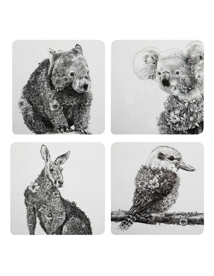 This set of coasters from the Marini Ferlazzo range features beautiful black and white illustrations of our native wildlife. The set includes depictions of a wombat, kangaroo, kookaburra and koala. Each piece is a celebration of our native fauna and makes a lovely addition to any table setting.